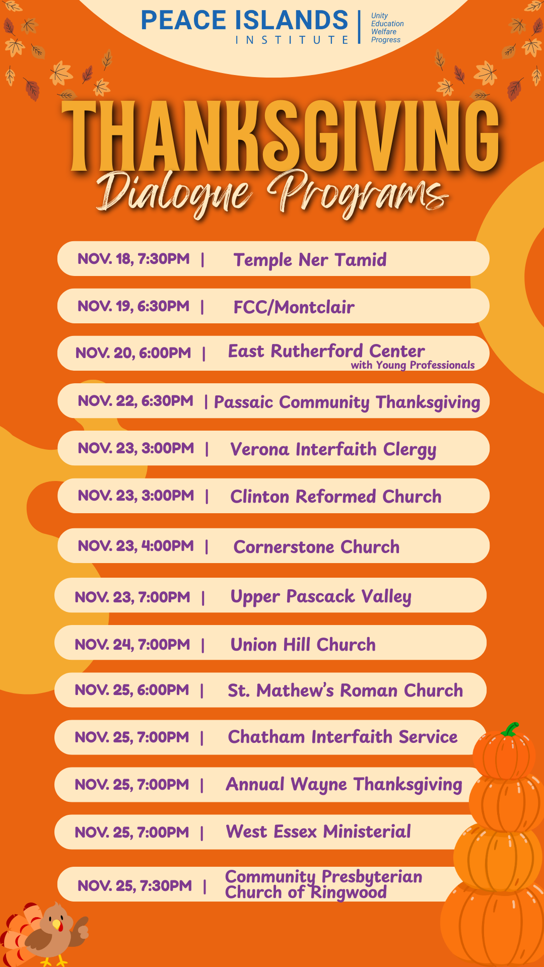 Our annual interfaith Thanksgiving gatherings bring together friends from diverse backgrounds to share gratitude, dialogue, and community spirit as well as volunteer initiatives addressing local needs and promoting shared responsibility. Events are being planned across New Jersey, and some of the Thanksgiving dates are shared in this flyer.